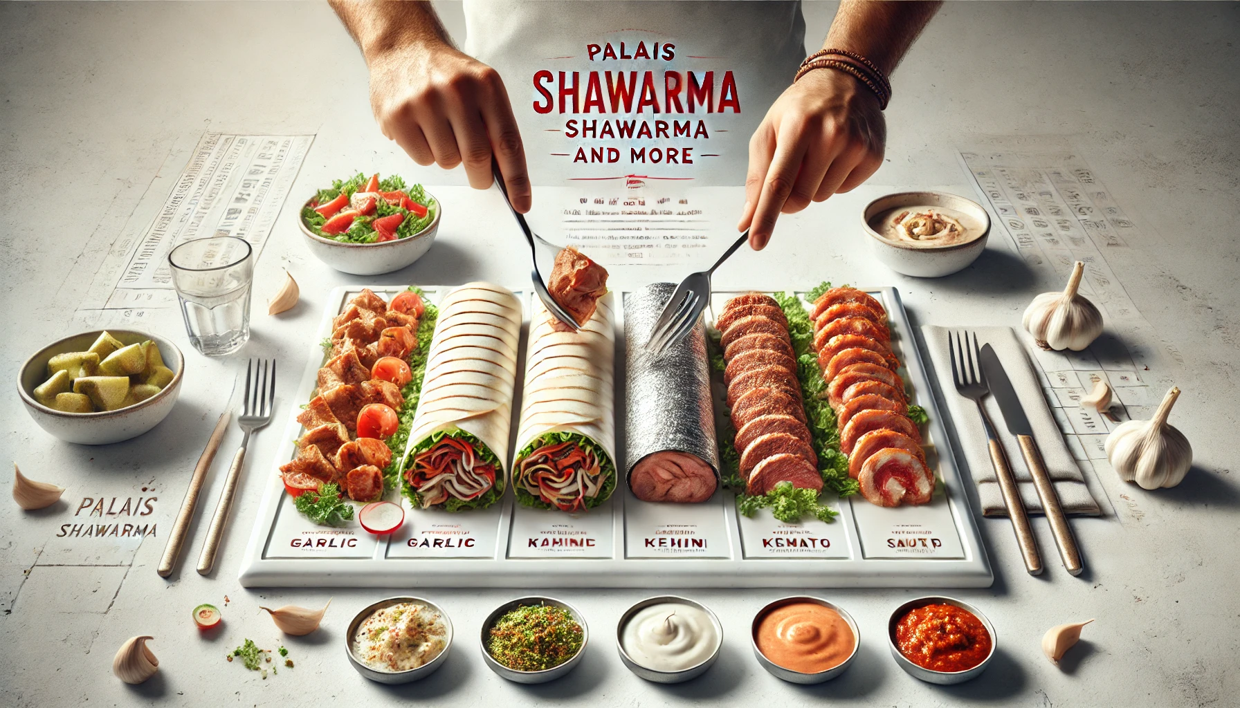 Schawarma Fleisch, Salat, Tomaten, eingelegte Gurken, Knoblauch Dip